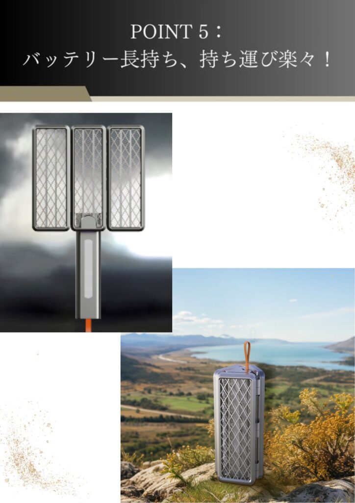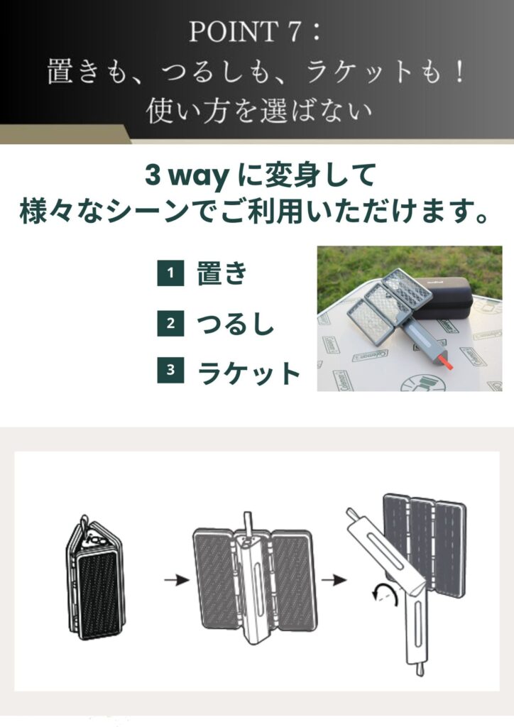 - 殺虫剤や煙を使わず使う場所を選ばない。置いても、つるしても、ラケットで虫を叩いても◎