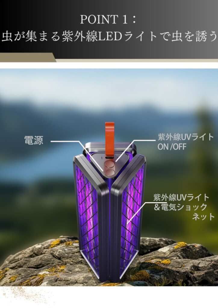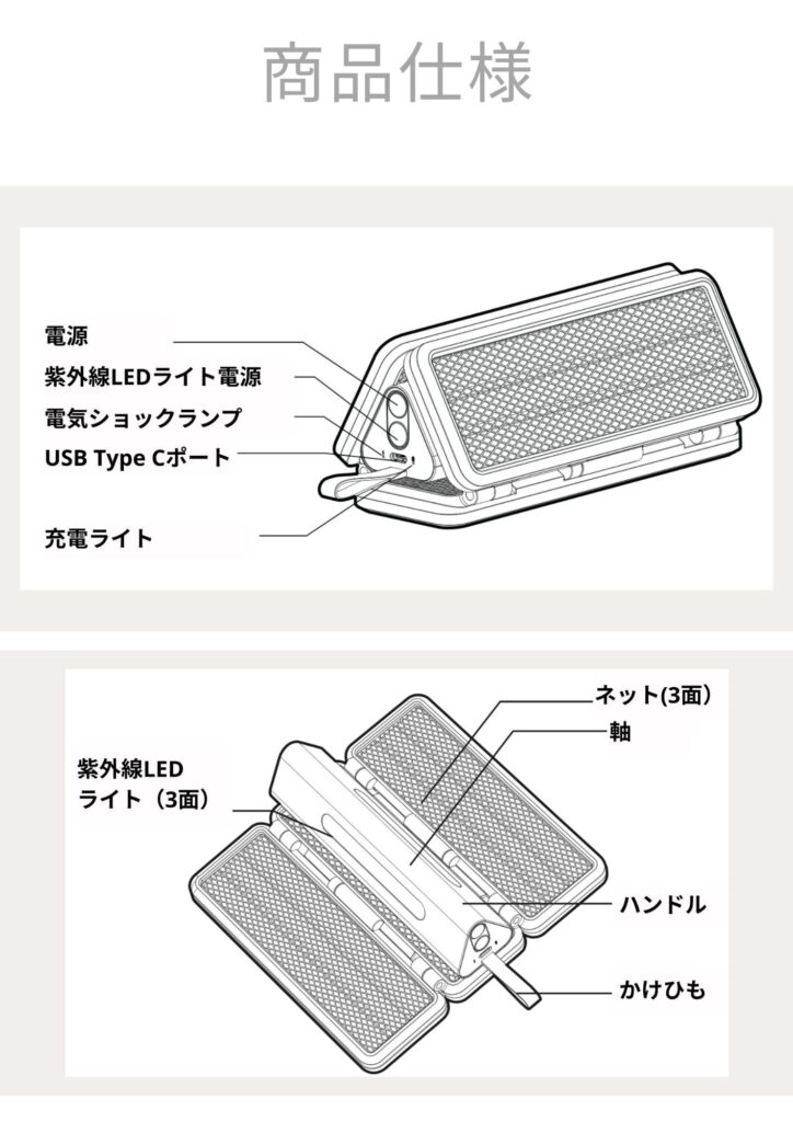 - 虫が最も好む365nmの紫外線LEDライトで虫を強力におびきよせ、電気ショックで電撃アタック!