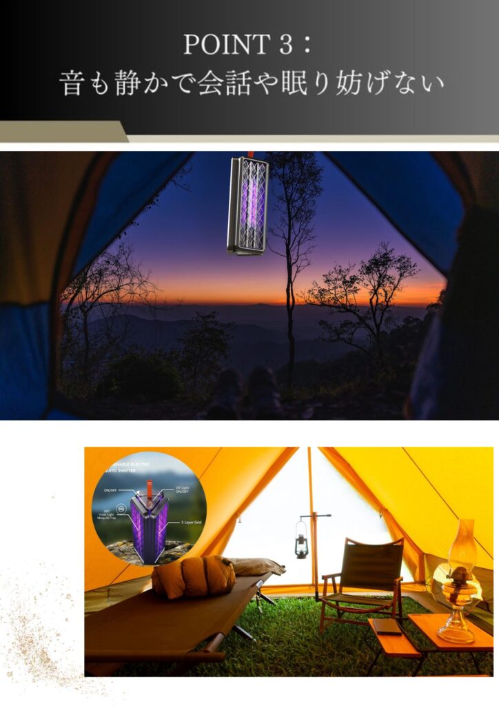 ファンなどによって常時音を発する構造でないため、テントなどでの就寝中でもご利用いただけ、皆様の、そして大切なお子様やペットの安らかな夜を守ります。