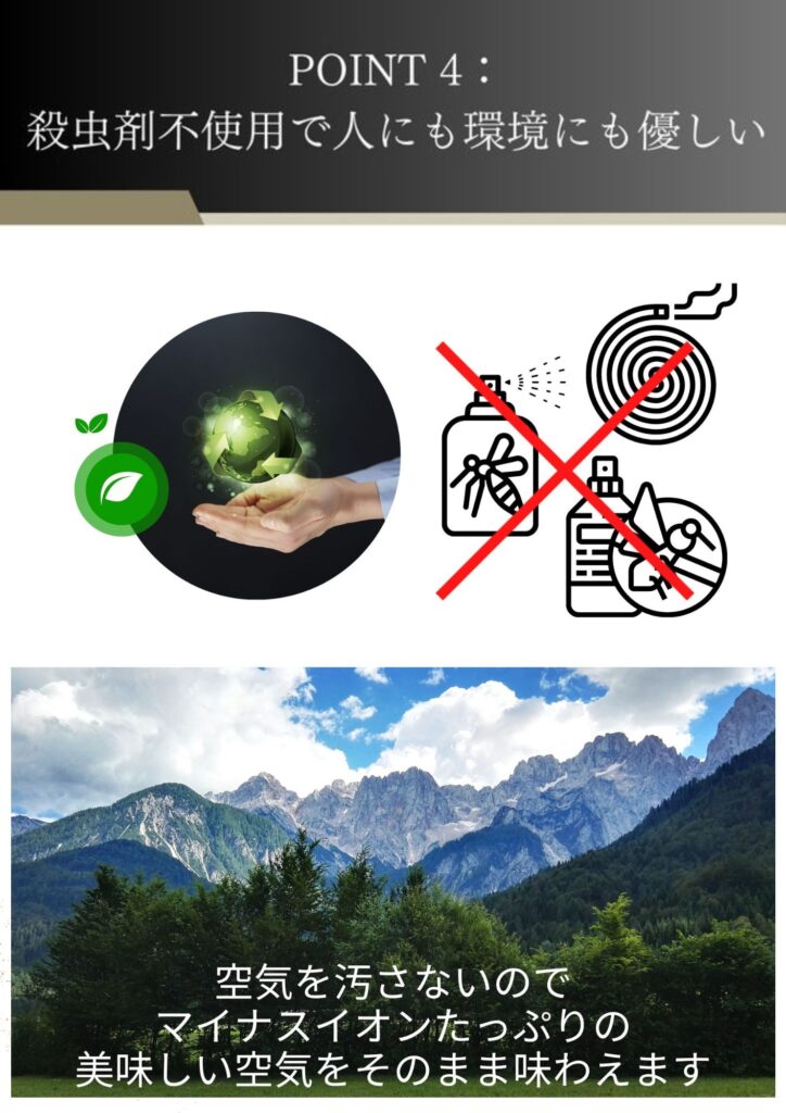 殺虫剤などの化学薬品や煙も不使用で、人体や環境に悪い影響を及ぼしにくく、食べ物を近くで扱う、キャンプやバーベキュー、釣りなどのアウトドアのほか、寝室、キッチン、お庭でのご利用、また店舗などでのご利用など、あらゆるシーンで安心してご利用いただけます。