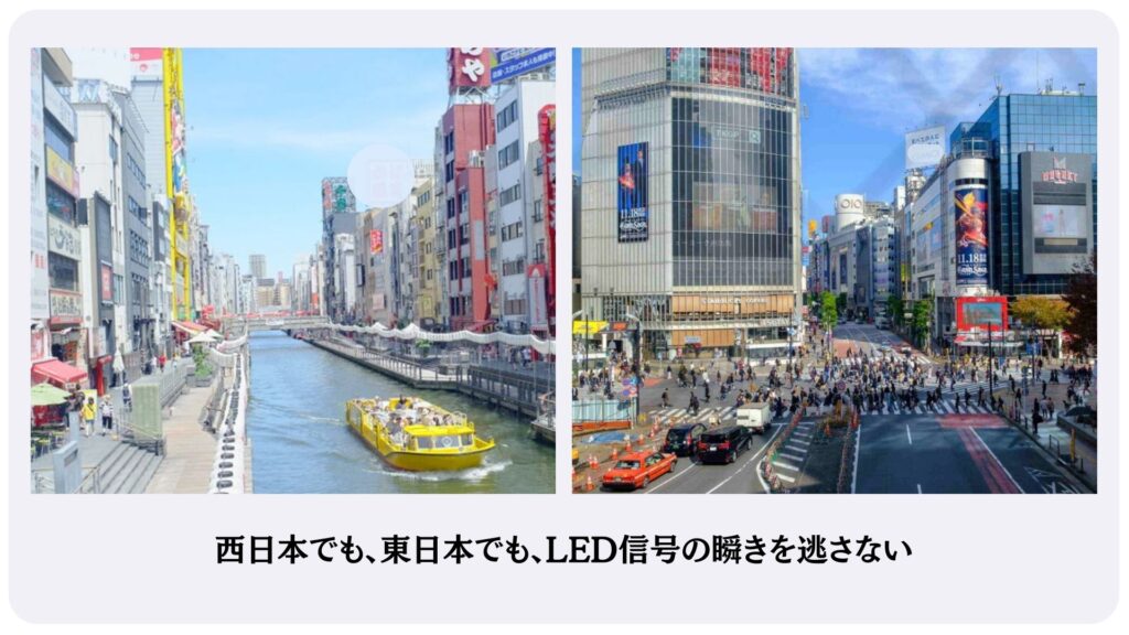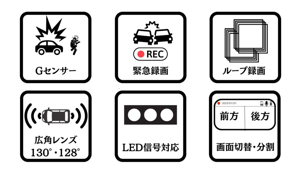 LED信号は超高速で点滅しており、ドライブレコーダーの機種によっては、信号の色が把握できなかったり、点滅していることがあります。本製品は、東日本(50Hz)、西日本(60Hz)の異なる電波数のLED信号をの点灯を漏らさずとらえるフレームレート27.5fpsを採用。交差点の事故などの際には、事故の過失割合を決める上で確実な証拠となります。