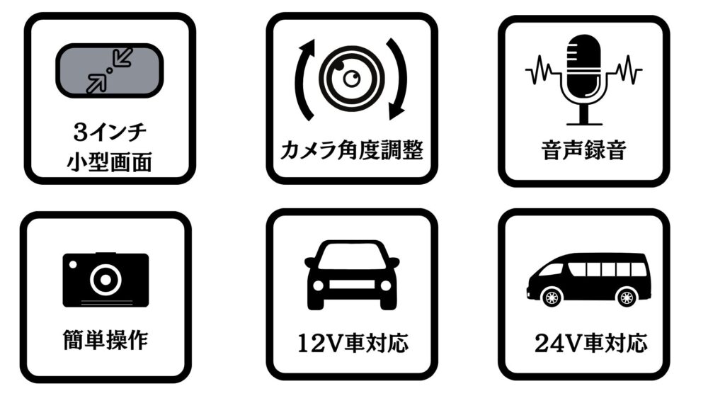 1、常時録画、2、緊急録画、3、静止画、の3つの録画機能が搭載されており、状況に応じて記録されます。またそれぞれ別のフォルダにデータを保存します。