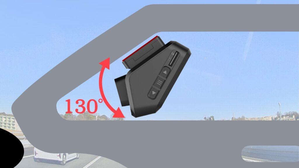 最大130°までカメラの角度を調整することができます。お乗りの車のフロントガラスの角度に合わせて調整いただくことにより、適した視野を保つことができます